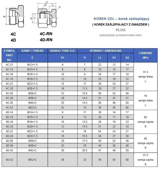 Korek zaślepiający przeznaczony do zaślepiania końcówek z gwintem wewnętrznym oraz stożkiem M52x2. Oznaczenie alternatywne XROV 42L CF