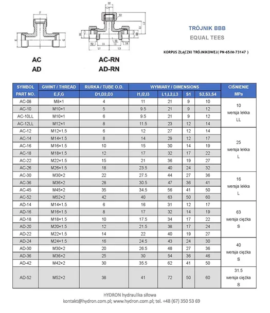 Złącze trójnikowe, znormalizowana wersja lekka ze stożkowym samo-uszczelnieniem zaciskowym przy dokręcaniu. Przeznaczone do łączenia trzech przewodów hydraulicznych lub do łączenia z innymi złączami z tym samym systemem stożkowym.